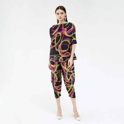 Casual Printing Suit Short-Sleeved Top Draped Pants Two-Piece Set for Women