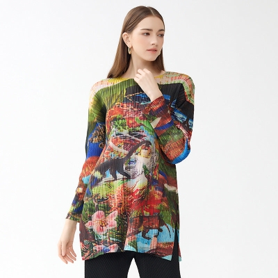 Dinosaur Painting Printed round Neck Long Sleeve Slim Design plus Size T-shirt