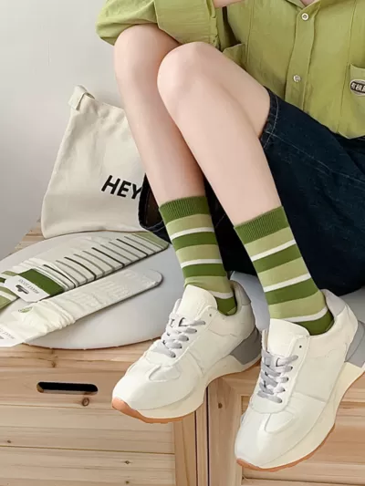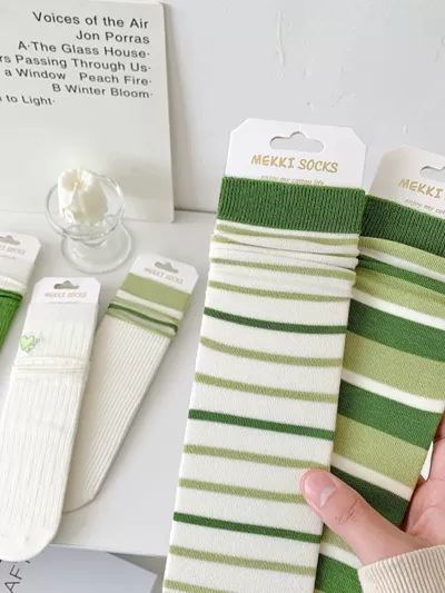 [5 Pairs] Thin Grass Green Series Stripe College Style Flat Sock