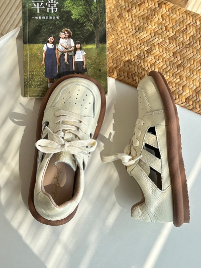 Hollow leather round head flat-soled big head shoes, soft-soled Roman sandals for summer wear