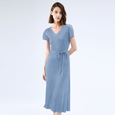 Folding Sleeve Dress Grade Solid Color Casual round Neck Mid-Length Slim Fit A- line Dress Women