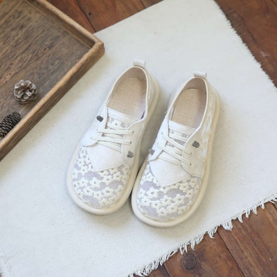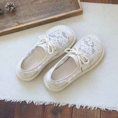 Mesh daisy round head shallow mouth flats summer sweet ruffle edge lace up comfortable single shoes